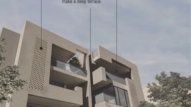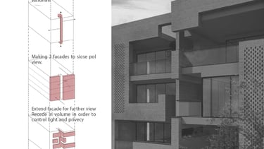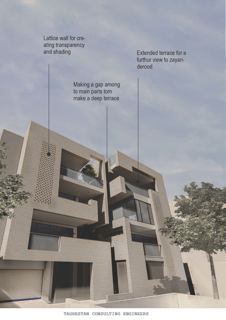 هدف پروژه، طراحی ۶ واحد مسکونی با در نظر گرفتن محدودیتهای سایت و ایجاد تنوع بصری بوده است. احترام به بافت تاریخی از طریق جدارهسازی آجری هماهنگ با معماری تاریخی پیرامون در تهیه طرح در نظر گرفته شده است. در طرح از تکنیکهای متنوع بازی با نور و ایجاد سایهروشن و جدارهسازیهای مشبک آجری استفاده شده تا بازسازی فضای همخوان و مناسب با بافت پیرامون تقویت گردد. بافت آجری سطح نما در طول روز با تغییر زاویه تابش نور خورشید، عامل ایجاد سایهروشنهای متفاوت شده و هر لحظه جلوهای تازهتر را باعث میگردد.