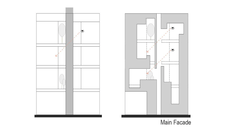 استفاده از تراسها، هم برای ایجاد تعامل و هماهنگی با محیط اطراف و هم ایجاد گشودگیهای بلند، متناسب با سبزینگیهای موجود در تراس و نیز رعایت سلسله مراتب صلبیت تا شفافیت بوده است که از جدارهی صلب با نزدیک شدن به هستهی مرکزی به فضای نیمه شفاف و بعد از آن فضاهای شفاف که همان تراسها هستند میرسیم.