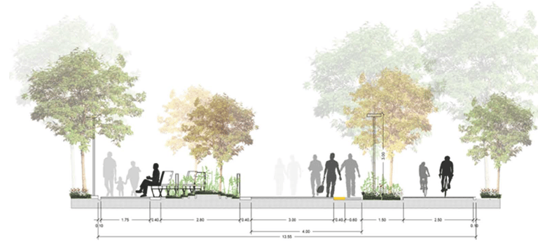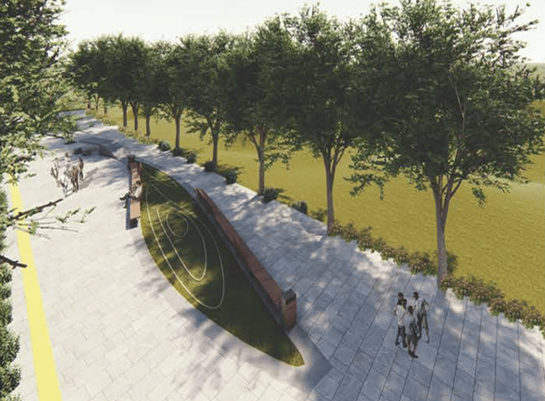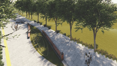 در ابتدا، انتها و میانه این مسیر - در محل تقاطع محورهای اصلی - نشانه‌ها و فعالیت‌های شهری و ویژه‌ای همچون مرکز هنرهای تعاملی، کوشک باغ ایرانی و باغ سران در کنار ساختمان و المان شهری هفت شهر مستقر گشته‌اند. بازدید کننده پس از عبور از میان تپه‌های رنگین و سبز پراکنده در پارک با گام نهادن به این محور به تجربه شکوه و عظمت دست می‌یابد.
